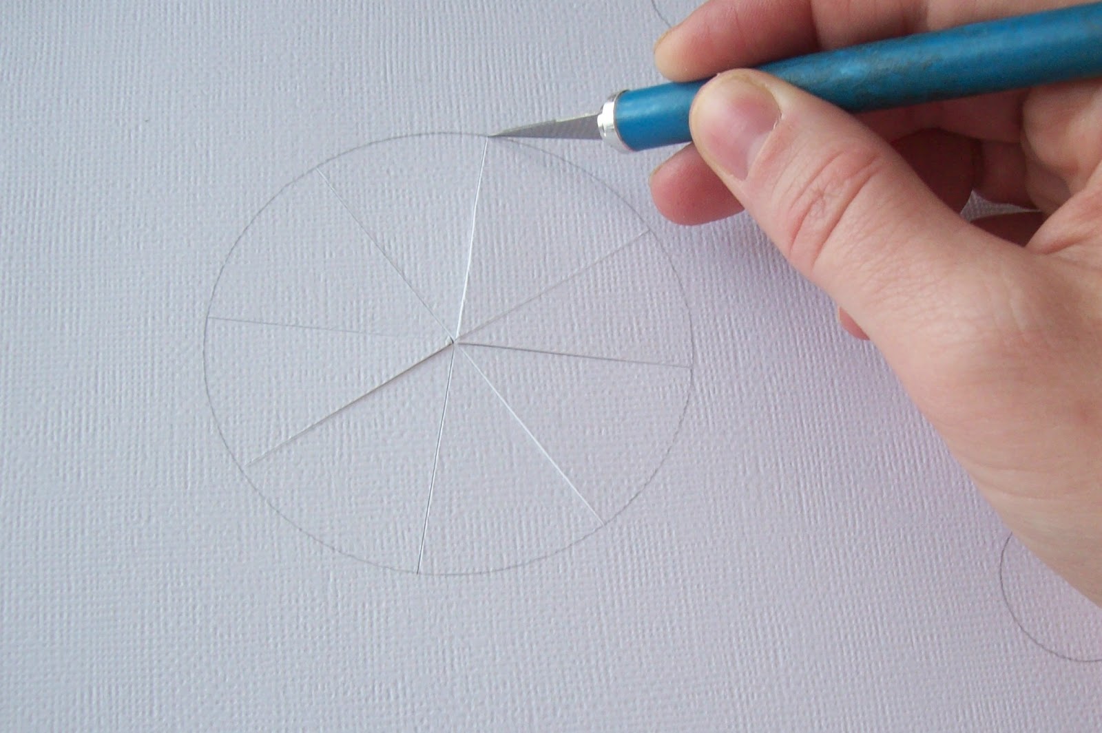 Ensuite, avec votre exacto vous coupez à l'intérieur de vos cercles des lignes droites, pour faire des pointes de tartes, d'un côté du cercle à l'autre, comme sur les 2 photos qui suivent :