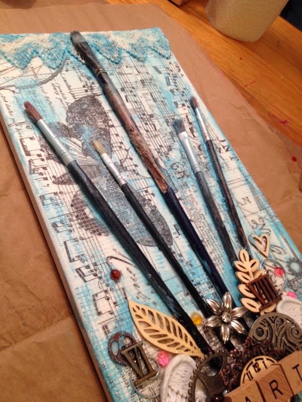 Tout d'abord, le matériel nécessaire: eau en vaporisateur, ruban adhésif pour faire des joints, morceau de dentelle, embellissements divers en bois et métal, canevas 7X14, gesso, vernis-colle Decoupage, gel médium ultra gloss de Liquitex, encres en sprays Tumble dye et Dylusions, papier de soie Tim Holtz, peintures acryliques et Silks, poudre Luminarte et vieux pinceaux en bois un peu maganés!